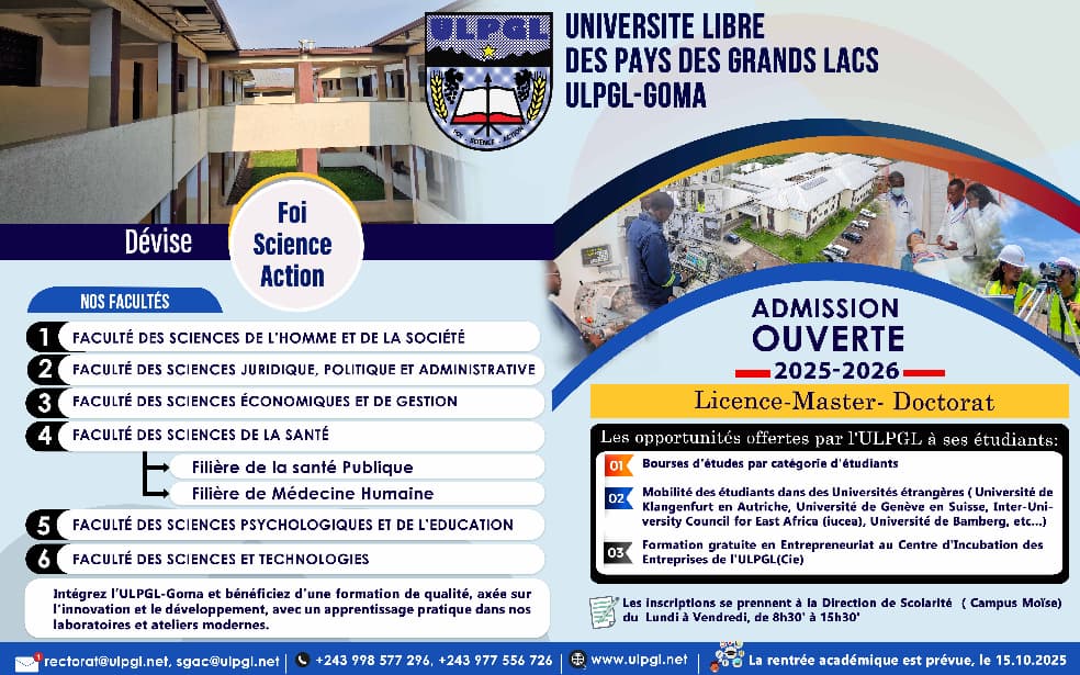 L’Université Libre des Pays des Grands Lacs (ULPGL-Goma) organise, ce vendredi 5 septembre 2025, sa cérémonie de collation des grades académiques sur le Campus Salomon. Ce grand rendez-vous réunira la promotion 2024-2025, les autorités académiques, les enseignants, les familles et de nombreux invités venus partager ce moment de fierté et de reconnaissance. Au-delà de la […]